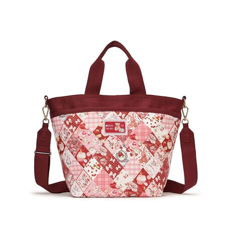 「Tea Party」をテーマにした華やかなパッチワーク風プリント。スイーツやフルーツ、バラ、ティーカップなどが描かれた可愛らしいデザインは、持つだけで毎日のお出かけがもっと楽しく。ゴールドの金具がアクセントとなり、レトロ&ガーリーな雰囲気を引き立てます。