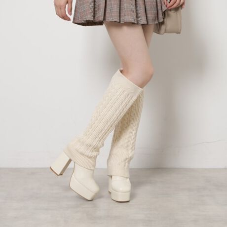 ストレッチブーツにケーブルニットを合わせ、ブーツにレッグウォーマーを重ねたようなデザインがY2Kスタイルにばっちりハマる新感覚アイテム。