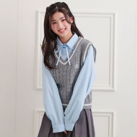 シャツとニットがドッキングした1枚で、レイヤードスタイルが完成する便利なトップス。