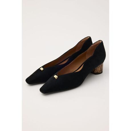 [型番:350IA111-1130]レトロムード漂う、感度高めなデザインがきいたシューティー。履き口部分は可憐な印象のスカラップデザインにゴールドのビーンズもポイント。バックスタイルにもぬかりないマーブル柄のブロックヒールが安定感とコーディネートのアクセントに。エレガンはもちろんのことカジュアルなスタイルでもおしゃれかつレディらしいスタイルに格上げしてくれます。
