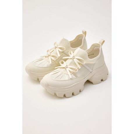 定番&人気のボリュームソールスニーカーに新デザインが登場。オリジナリティ溢れる、スリムなダブルリボン装飾が程よくフェミニンンかつ個性が際立つデザイン。足を包み込む優しい足あたりのニット地×サテンリボン×レザーコンビの細やかなディテールが秀逸。見た目以上に履き心地に定評のある、程良いボリューム感と弾力のあるオリジナルラギットソールが快適かつストレスフリー。また、スニーカー見えながら履き口ニット素材なのでスリッポンタイプで着用いただけます。(シューレースはデザインです。調節不可)