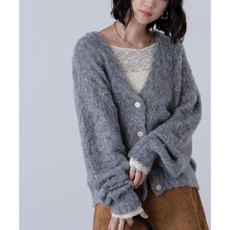立体感のあるウェーブシャギーが映えるシンプルなVネックカーディガン。ウェーブ状の起毛加工を施したふわふわのタッチに、貝調ボタンがアクセントになっています。厚手すぎず、程よいボリュームの編地なので、秋はアウターの代わりに羽織ったり、冬はコートインにもぴったり。ミニボトムスにも合わせやすい着丈感で、低身長さんにもおすすめです。デニム合わせはもちろん、ミニティアードスカート、プリーツスカートも相性バツグン。Tシャツやタートルネックニットなどとレイヤードも楽しめます。※モデルの着用画像の場合、光の当たり具合により、実際の色味と異なって見えることがございます。色味は、商品単体の画像をご参照ください。