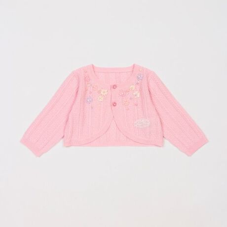 砂糖菓子のようなやわらかなカラーのリボン刺しゅうとお花を添えたニットボレロです。