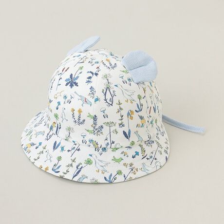 草木や鳥が描かれたリバティファブリック「THEO」を使用したジョッキー帽子です。