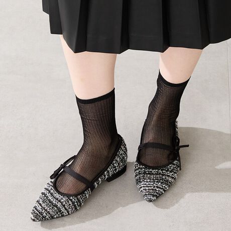 シーズンムード高まる多彩なツイード素材にラメ糸を織り込み、足元に華やかさを添えてくれる特別感のあるフラットパンプス。