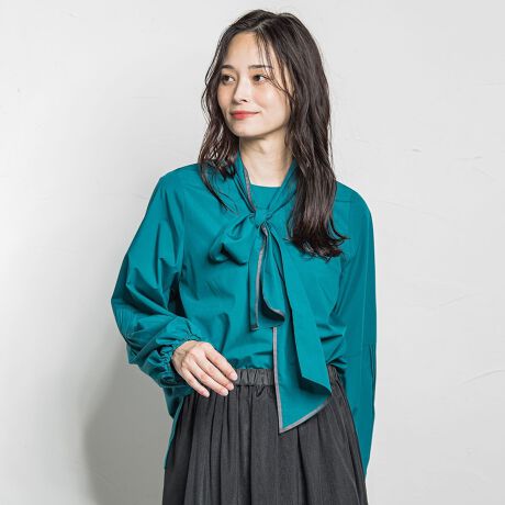 首元のリボンが華やかさを添えるボウタイブラウス。