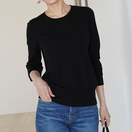 シルク混の美しい表面感としっとりとした優しい風合い、着まわし力の高さが魅力の“アデルクルーネックニット”