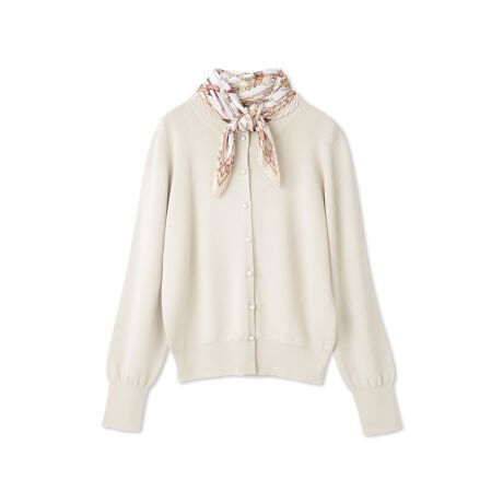 すっきりとしたクルーネックカーディガンに、プリーツ加工を施したプリントスカーフをセットしたニットです。