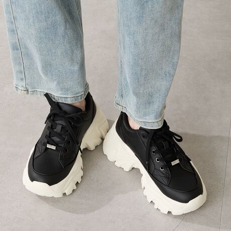 とことんボリュームのあるソールがスタイルアップを叶えてくれるスニーカーは、オリジナルの金具パーツでアクセントを効かせた1足。