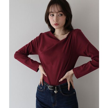 デコルテを美しく見せてくれるドレープデザインで、カジュアルながらも女性らしさを演出します。
