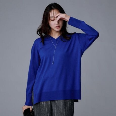 気になるヒップをカバーして細身パンツにも合わせ易い、長め着丈のニットです。