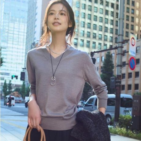 シャープめなVネック開きは一枚着としての着回しはもちろん、