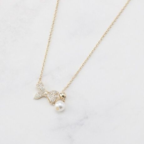 きらきらしたリボンと一粒パール調モチーフが華やかなロングネックレス。