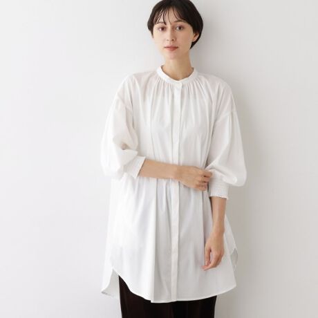 お袖のゴムシャーリングや、体型を拾いにくい絶妙な丈と身幅感が特徴のアイテムです。