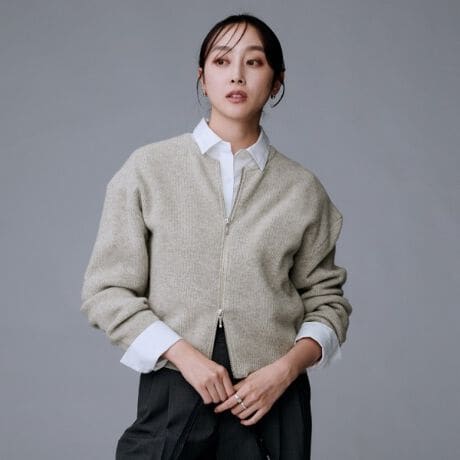 シャツやブラウスに羽織って逆開ファスナーを少し開けて、インナー見せると、こなれたスタイルになります。