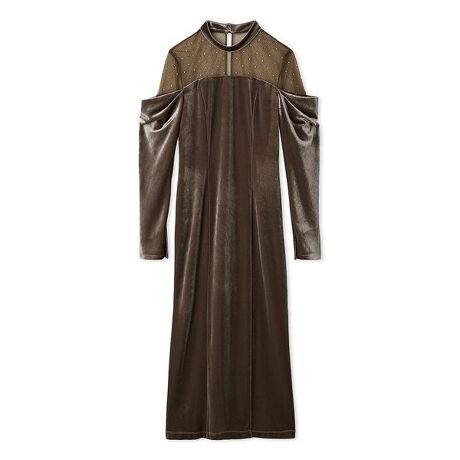 ベロアはエレガントなオフショルダーデザイン。さらにチョーカーのように見えるスタンドカラーをプラスしているので、トレンド感も楽しめます。
