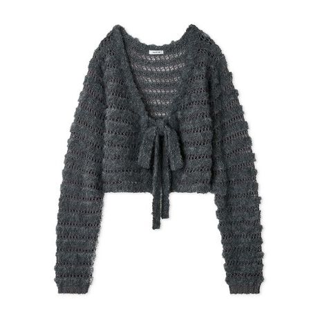 ふわりとした毛足の部分と、透け感のあるネット編みの部分がボーダー状になった、個性的な編み地のカーディガン。