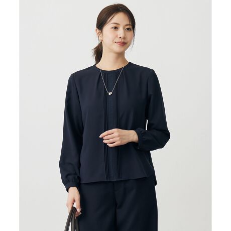 ■デザインクルーネックの上品なブラウス。フロントには繊細なレースとピンタック、タックをプラスし華やかに仕上げました。長袖の袖口にはギャザーを施し、ふんわりと女性らしい印象に。1枚でさらりと着るのはもちろん、ジャケットのインナーとしても活躍する、着回し力の高い1着です。カラーは、優しく上品なアイボリー(#002)、シャープで信頼感のある印象のネイビー(#075)の2色展開です。
