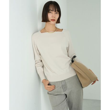 ■デザイン首元があきすぎないスクエアネックで、デコルテラインを美しく見せてくれるネックデザイン。肩の切り替えがないため、肩まわりにゆとりがあり、肩幅を気にせず着用できるラグランスリーブです。程よいサイズ感でリラックス感がありながらも、上品な印象に。1枚で着映えながら、ジャケットのインナーとしてもご着用いただけます。