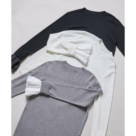 袖口に布帛のフレアカフスをドッキングしたハイゲージのキレイめニット。1枚で着るのはもちろん、ジャケットの袖口からさり気なくフレアカフスを覗かせると、品の良いアクセントに。身頃はすっきりとしたシルエットなのでインナー使いにもぴったり。シンプルながらもディテールで差がつく、着回し力の高いアイテムです。<素材>しなやかなハイゲージニットを使用しています。<詳細>仕様・開閉なし裏地・なし透け感・なし / 光沢・なし / 伸縮性・あり生地の厚さ・普通<関連商品>■カフスドッキングカットソー[品番:0176168110]※モデルの着用画像の場合、光の当たり具合により、実際の色味と異なって見えることがございます。色味は、商品単体の画像をご参照ください。