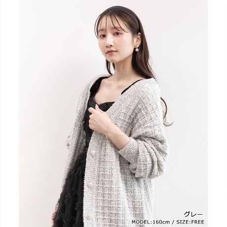 ラメ糸とファンシーヤーンを贅沢に編み込んだ、上品な光沢が魅力のニットカーディガン。