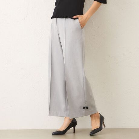 センターにつまみピンタックを施した、すっきりとした印象のワイドパンツ。ノンタック仕様で腰回りをきれいに見せつつ、ウエスト後ろにのみギャザーを寄せた平ゴム入りで快適なフィット感を実現しました。裾のモチーフは取り外し可能です。