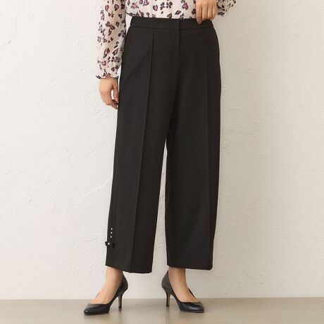 センターにつまみピンタックを施した、すっきりとした印象のワイドパンツ。ノンタック仕様で腰回りをきれいに見せつつ、ウエスト後ろにのみギャザーを寄せた平ゴム入りで快適なフィット感を実現しました。裾のモチーフは取り外し可能です。