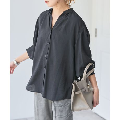 たっぷりとした袖のボリュームが印象的で、女性らしい上品なシルエットを演出。スキッパーデザインの首元はすっきりとした印象で、顔周りを軽やかに見せてくれます。フロントはボタン開き仕様のため、1枚で着用するのはもちろん、羽織としてもコーディネート可能。