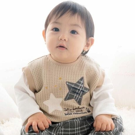 ワッフルのベストを重ね着した様に見える男の子ベビー用長袖トレーナー。