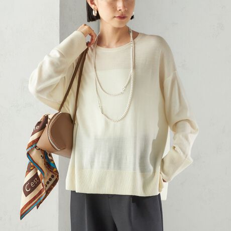 襟ぐりの開きにこだわった14ゲージのクルーネックプルオーバーです。
