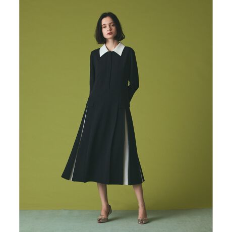 清楚&クラシカルな雰囲気を醸し出すクレリックカラーが印象的なシャツドレス。しなやかで上質なダブルクロスのトリアセ素材を贅沢に使用。歩くとボックスプリーツの中の配色ラインが見え隠れする、モダンなデザインが一際目を惹きます。楽な着心地ながら細かくダーツの処理をする事でスタイルアップになり、女性らしい華奢を感じられるデザインに。襟付き・袖あり・膝下の露出度控えめなルックスで、お食事会やお呼ばれシーンにもぴったりです。パンプスやパールアクセサリーなどで綺麗めに着て頂くのはもちろんの事、ミリタリーコートなどを羽織ってカジュアルダウンさせたMIXスタイルもおすすめです。