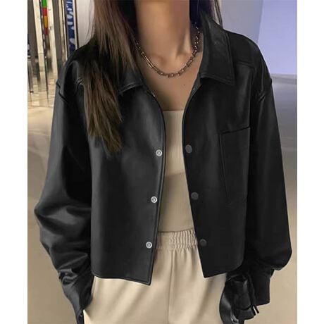 すっきりしたシルエットでシャープな印象の、ショート丈フェイクレザージャケットが新登場。