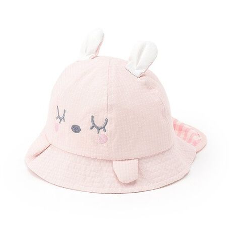 うさぎのmimiちゃんのモチーフが目を引く、うさ耳付き帽子。後ろには、日よけとしっぽ付き。お顔の下には、可愛らしい小さな手も付いています♪ご自宅用やギフトにおすすめです。