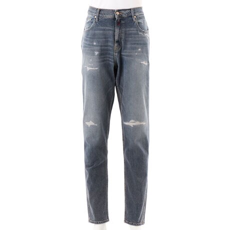 【SANDOT/サンドット】クリーンでコンテンポラリーなテーパード5ポケットデニム。ハイウエスト、腿はゆったり、裾に向かって適度なテーパードレッグのリラックスシルエット。<br>12オンスの比較的しっかりとしたインディゴカラーデニムをグリーンキャストのミディアムトーンにウォッシュ。オーセンチックなムードを出すため、コンフォートストレッチ。<br>- 手作業によるひげ加工と擦り切れ<br>- ポケットにダメージ加工<br>- リペア加工とミシン刺し<br>- コントラストをつけて使用感を軽めに表現<br>- 3Dマネキン乾燥で印象的な立体感のあるシワを創出