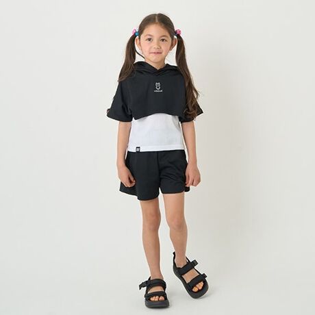 フーディーには、さりげないハートクマ刺しゅうがほどこされ、ウエストゴム仕様のショートパンツは、着脱も簡単で、お子さま一人でもお着替えできます。