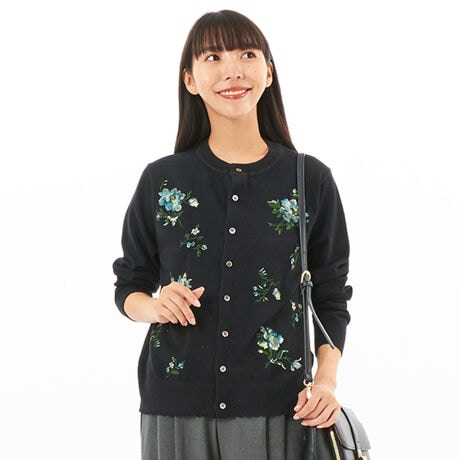 [型番:34840154]肌にやさしく、季節を問わず心地よく纏えるコットン100%のニットカーディガン。繊細なステッチで描かれた花々は、ブーケが軽やかに舞っているような印象になっています。裾にはスカラップ編みを施し、シンプルなシルエットにフェミニンなニュアンスを添えています。ボタンの付け糸をアクセントにしました。