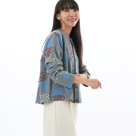 [型番:34940054]ニットジャカードを使用したカーディガン。フラワーポットに入ったお花たちとドット柄を、コットンポリエステルのダブルジャカードで表現しました。後ろのヨーク切り替えがガーリーな印象を与えてくれます。後ろの着丈を長めに、後ろヘムをカーブに仕上げました。オリジナル金属ロゴプレートを施しています。あると嬉しい便利な両サイドポケット付き。