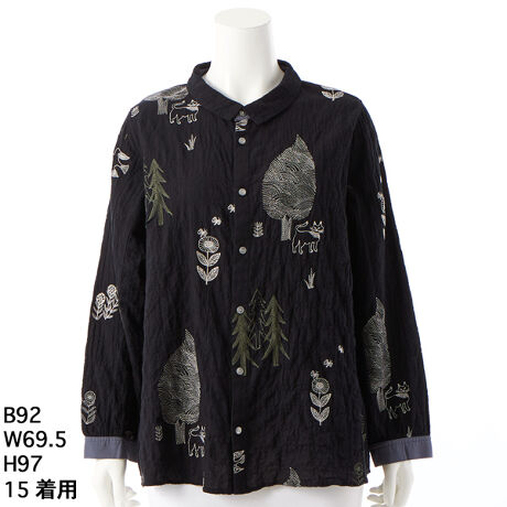 ナチュラルな凹凸感のある先染めのコットンシャーリングの、刺繍ブラウス。