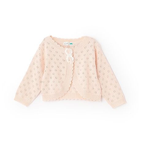 透かし編みの小花のような柄と、花モチーフが可愛らしいボレロカーディガン。アクリル綿で柔らかな風合いです。優しい色合いなので、合わせやすいアイテムです。