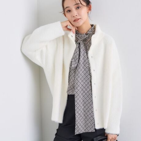 トレンドのシャギーニットで触り心地が気持ちよく、スタンドネックで首元まで暖かいアイテム。