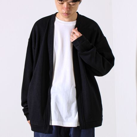 ・カーディガンはボタンレス仕様で軽やかに羽織れるデザイン
