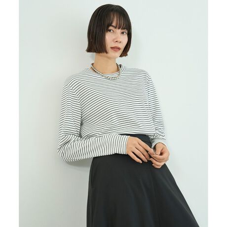 ■デザイン1枚でもレイヤードでも活躍する、着回し力抜群の万能Tシャツ。シンプルながらボディラインを拾わない程よいサイズ感にこだわり、1枚でこなれた印象に。ヘムラインは前後差のない直線ラインですっきりと見せます。今年らしいレイヤードスタイルにもおすすめです。今シーズンはベーシックなオフホワイトに加え、細ボーダーやブルーのアクセント入りのWボーダーをご用意いたしました。