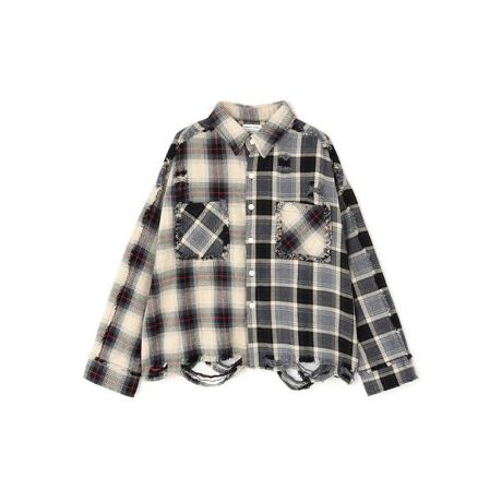複数のヴィンテージチェックパターンをドッキングし、左右非対称な大胆な切り替えデザインで仕上げた唯一無二の一着です。