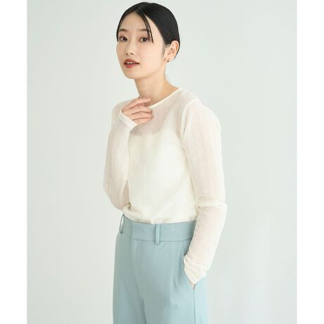 ■デザイン軽く、適度な透け感があり、一枚着としても華やかに見えるロンT。身体のラインを拾いすぎない絶妙なサイズ感や少し長めのお袖で、様々なアイテムのインナーとしても通年使える優秀アイテムです。衿にはストレッチテープを使用しています。※引っ掛かりやすい素材のため、アクセサリーやバックなどの着用時には充分ご注意下さい。