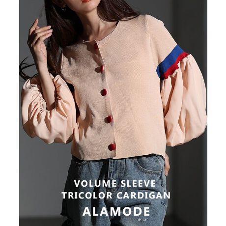 ランタンスリーブにトリコロールを思わせるポップな色使いが特徴的なカーディガンです。羽織としては勿論、トップスとして着ていただきたい一着です。スカートにデニム、どんなアイテムとも相性抜群です◎