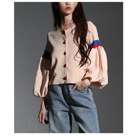 ランタンスリーブにトリコロールを思わせるポップな色使いが特徴的なカーディガンです。羽織としては勿論、トップスとして着ていただきたい一着です。スカートにデニム、どんなアイテムとも相性抜群です◎