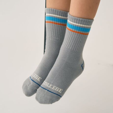 【ラインとカレッジロゴがアクセント】足首部分にカレッジ風のロゴとラインデザインが特徴のクルー丈ソックスです。
