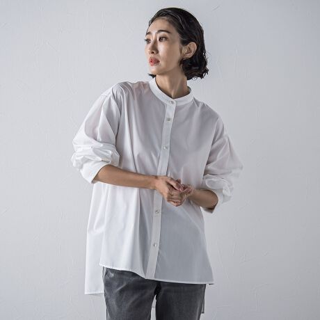 全体的にゆったりとしたシルエットでリラックス感がありながら、バンドカラーがすっきりとした顔まわりを演出します。