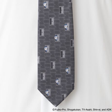 ひみつ道具の「どこでもドア」をモチーフにしたネクタイです。「どこでもドア」からドラえもんがちょこっと顔をのぞかせています。どこからどこへ行くのでしょうか?