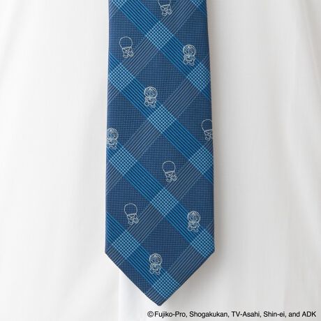 シャドーチェックにアウトラインのドラえもんを組み合わせたネクタイです。ドラえもんはお散歩中でしょうか?シンプルで同系色にまとめたチェック柄は合わせやすく、ギフトにもお勧めです。